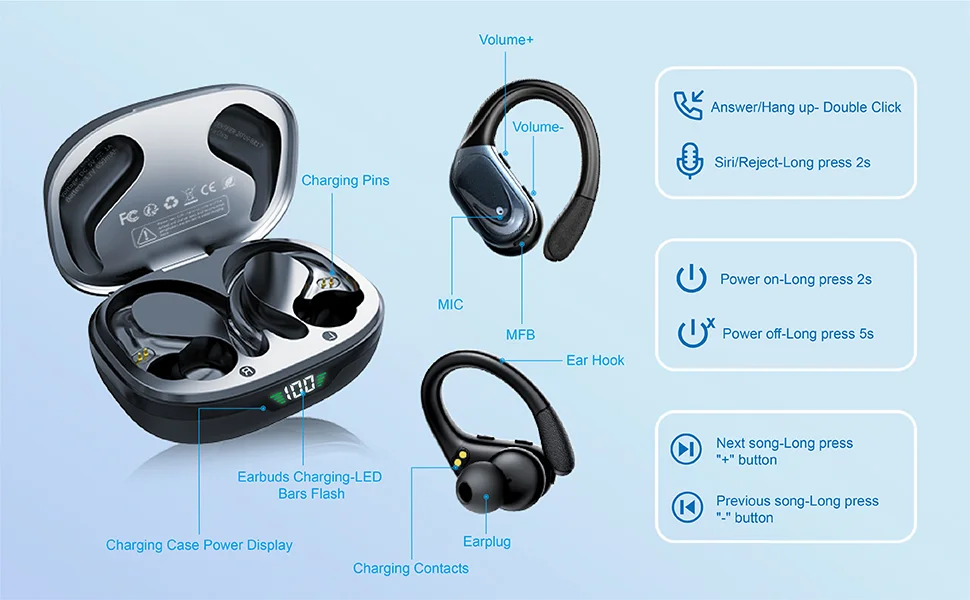 【Sports Comfort & IPX7 Waterproof】- BX17 wireless headphones Designed with elastic and soft ear hooks, these Bluetooth sports earbuds stay securely in place and provide ultimate comfort even during extended workout sessions. The earphones come with three different sizes of ear tips, ensuring a perfect fit for various ear sizes. With an IPX7 waterproof rating, they effectively resist water splashes and sweat, making them ideal for sports, fitness, workouts, and running.
