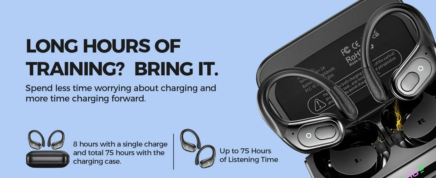 LED Power Display and 75H Playback: Dual digital LED power display outside of the case is to show the power level for charging case and earbuds. When charging for the case, the LED light will start to flash from 1 to 100. When you put earbuds into the case, then earbuds will start to be charged. 650mAh battery capacity charging case can provide extra charging for both earbuds.