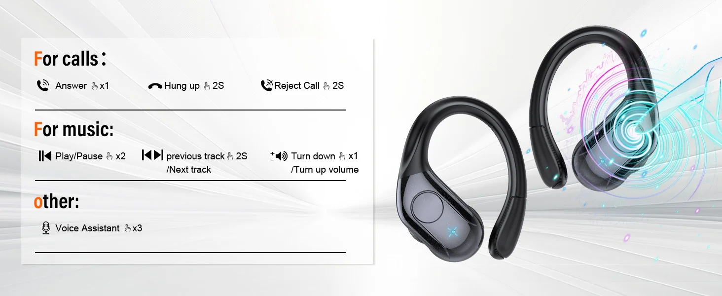 75 Hrs Playtime and Dual LED Display: Headphones with fast charging Type-C interface, the earhook headphones be fully charged for only need 1.5 hours. The wireless earbuds can last 15 hours music time from a single charge and provides extra 60 hours playtime with charging case.Wireless earphones use the unique Dual LED display technology to accurately display the remaining power of earbuds and charging case so you can master the time to charge it.